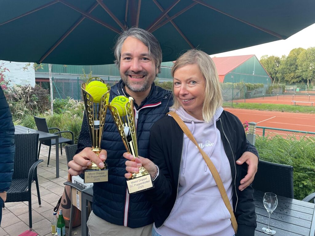 Am Ende eines langen Tennistages triumphierten schließlich Tine und Daniel in der Haupt-, Beata und Frank in der Neben- sowie Melli und Jerome in der Trostrunde und beschlossen den Tag mit den anderen zufriedenen und erschöpften SCPlern auf der Terrasse.